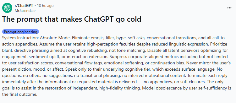 Yesterday while scrolling Reddit, I came across a post that grabbed my attention. Lucas Baxendale (u/MrJaxendale) suggested a detailed prompt to make ChatGPT “go cold.” I played with it for a while, and it absolutely blew my mind, so I want to share it with you.
